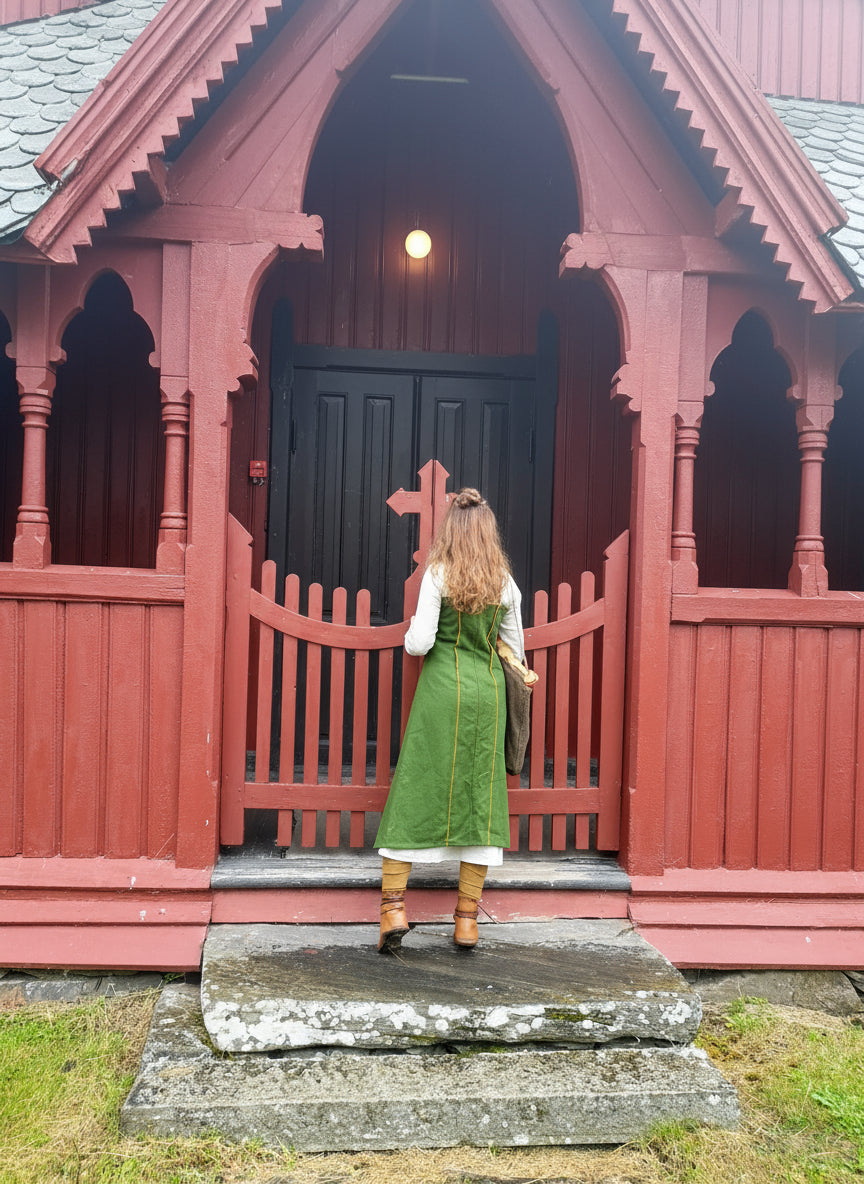 The FREYDIS Viking Age apron dress (hangerok) is an interpretation that reconstructs the specific Fragment H14A from Haithabu harbor into a fully wearable garment. To support this reconstruction, iconography of the time and similarities from other graves and archaeological textile finds from the Viking Age were consulted.