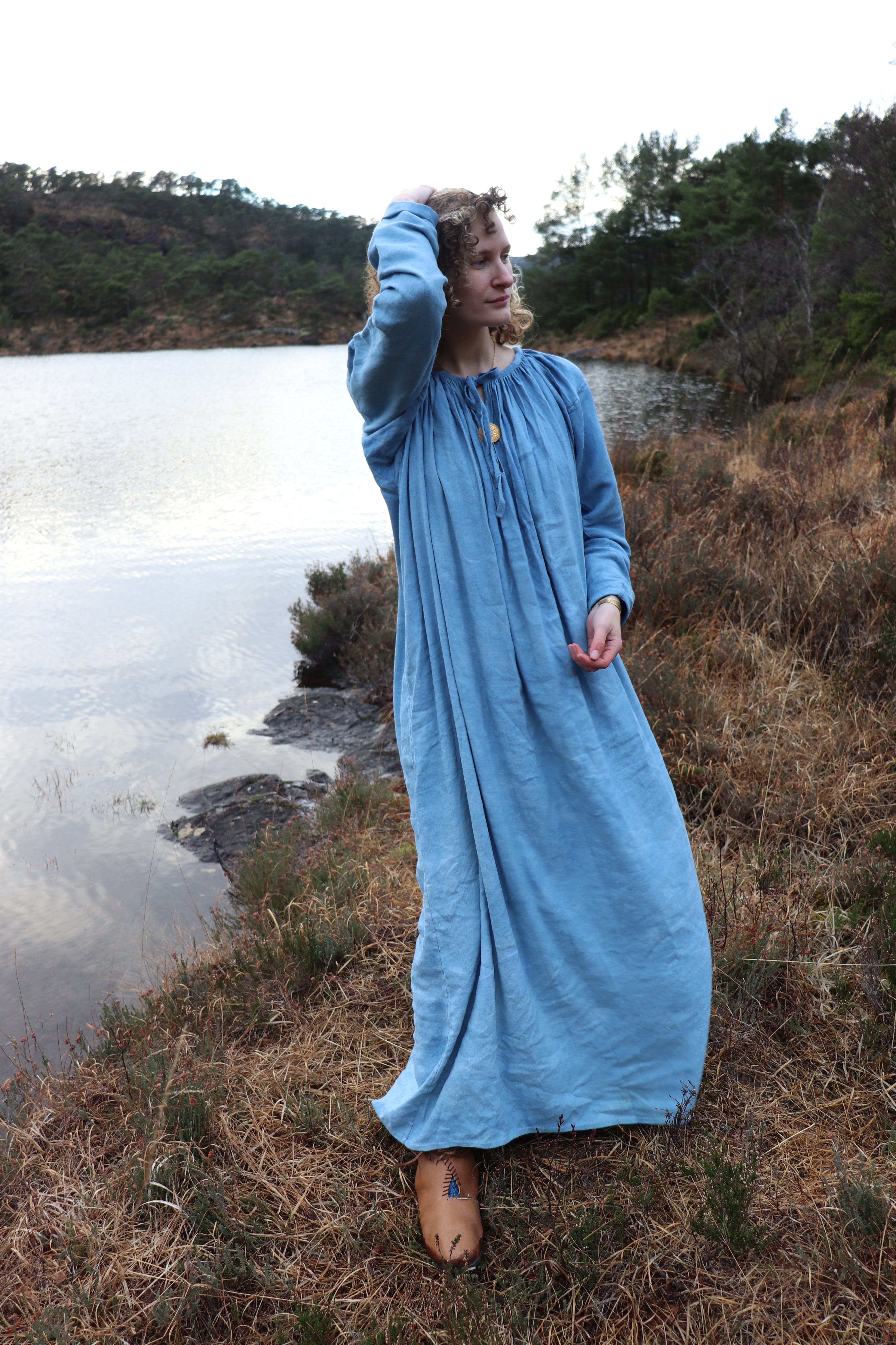 Our Pskov Linen Pleated Dress is a faithful, fully handsewn reconstruction of a historical find from Pskov, bringing the elegance and comfort of traditional Slavic fashion to life. This voluminous dress features expertly gathered pleats around the neckline, creating a beautifully flowing silhouette that ensures both ease of movement and a versatile fit, balancing practicality with historical style.