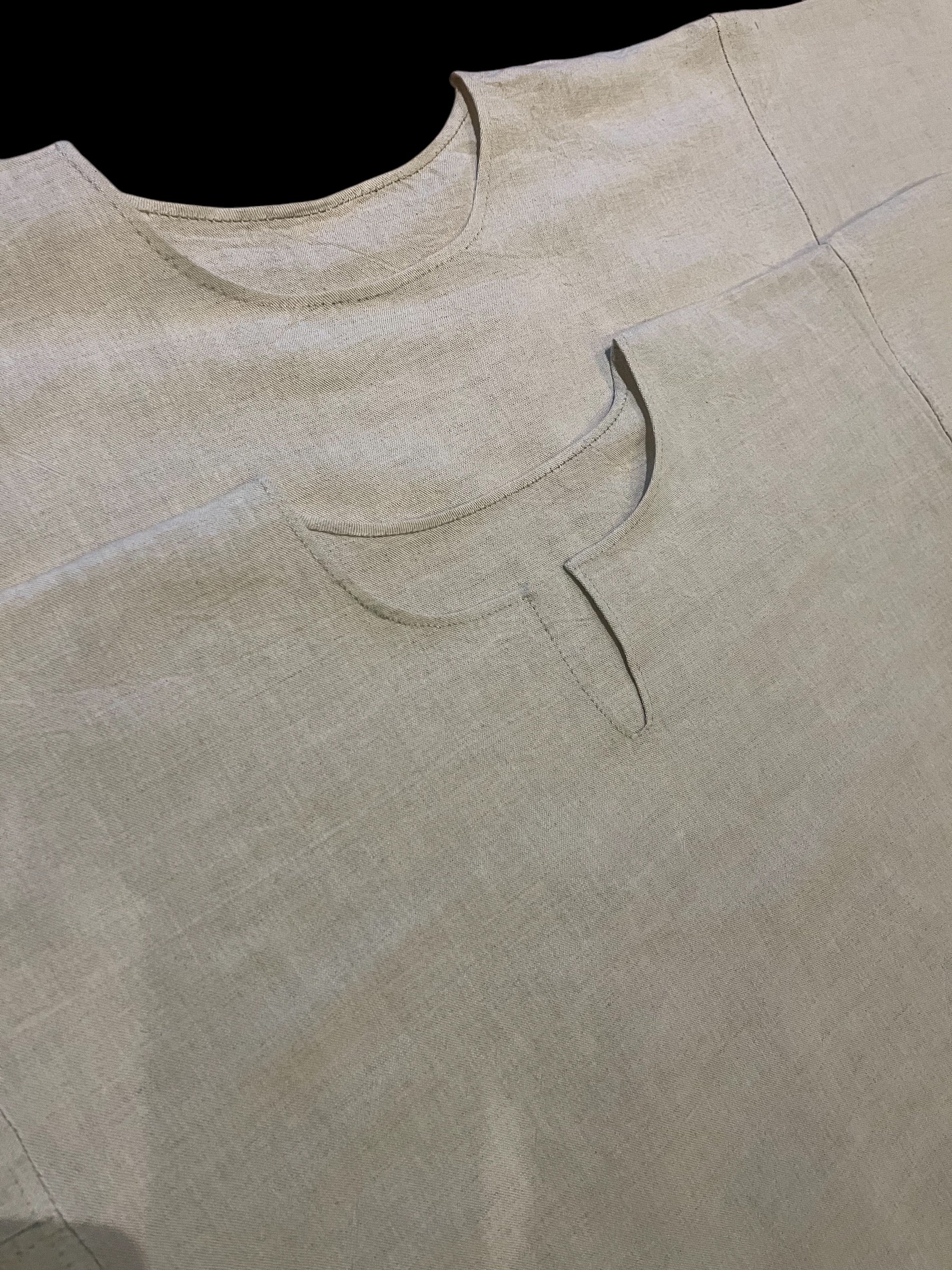 The core design draws from Haithabu's extensive textile archaeology (8th-11th century), particularly fragments 72 A & B, which provided crucial evidence of the distinctive curved armhole construction unique to this settlement. These fragments, along with pieces 64 & 65, revealed detailed information about seam techniques and typical stitch lengths of 3-5mm used in Viking Age garments.
